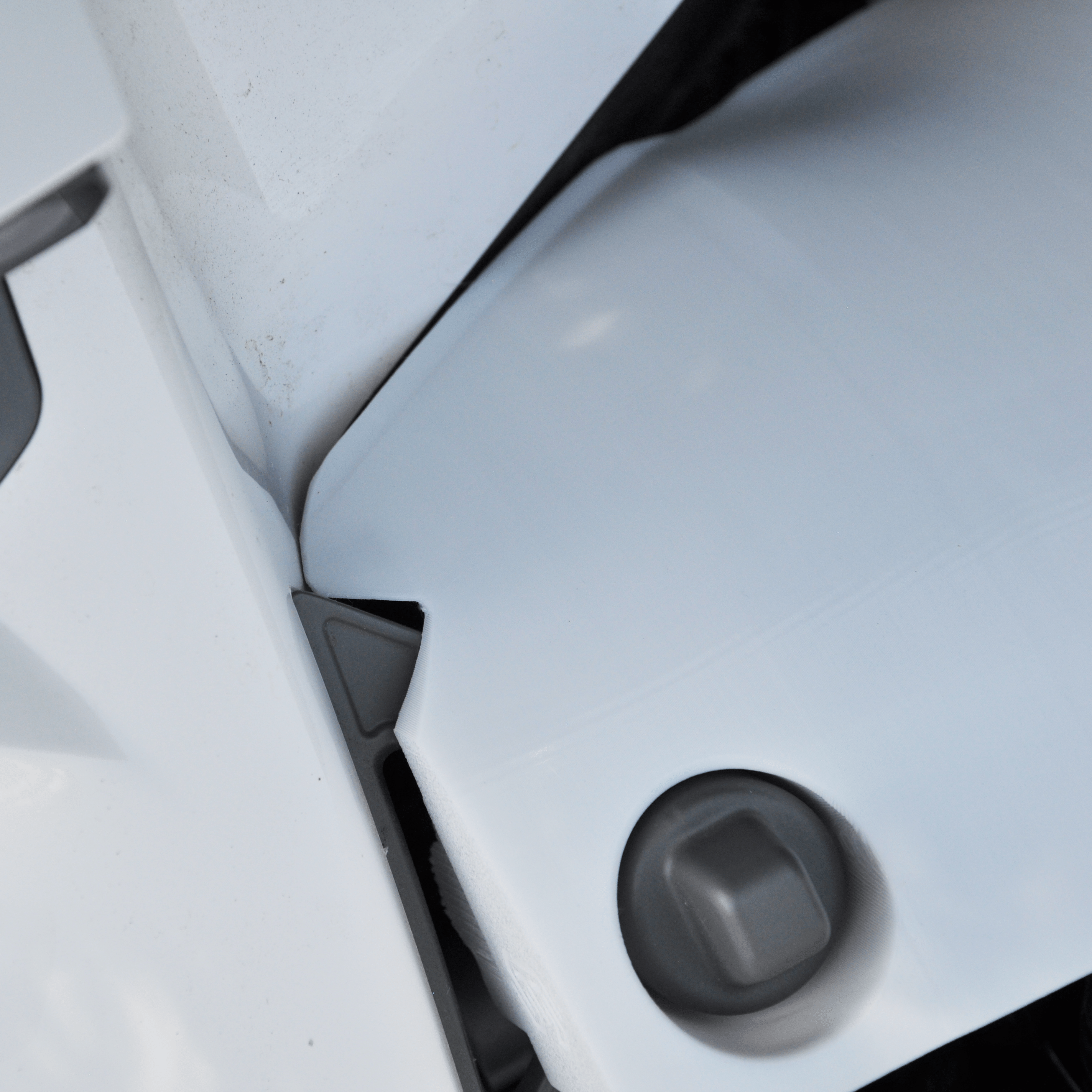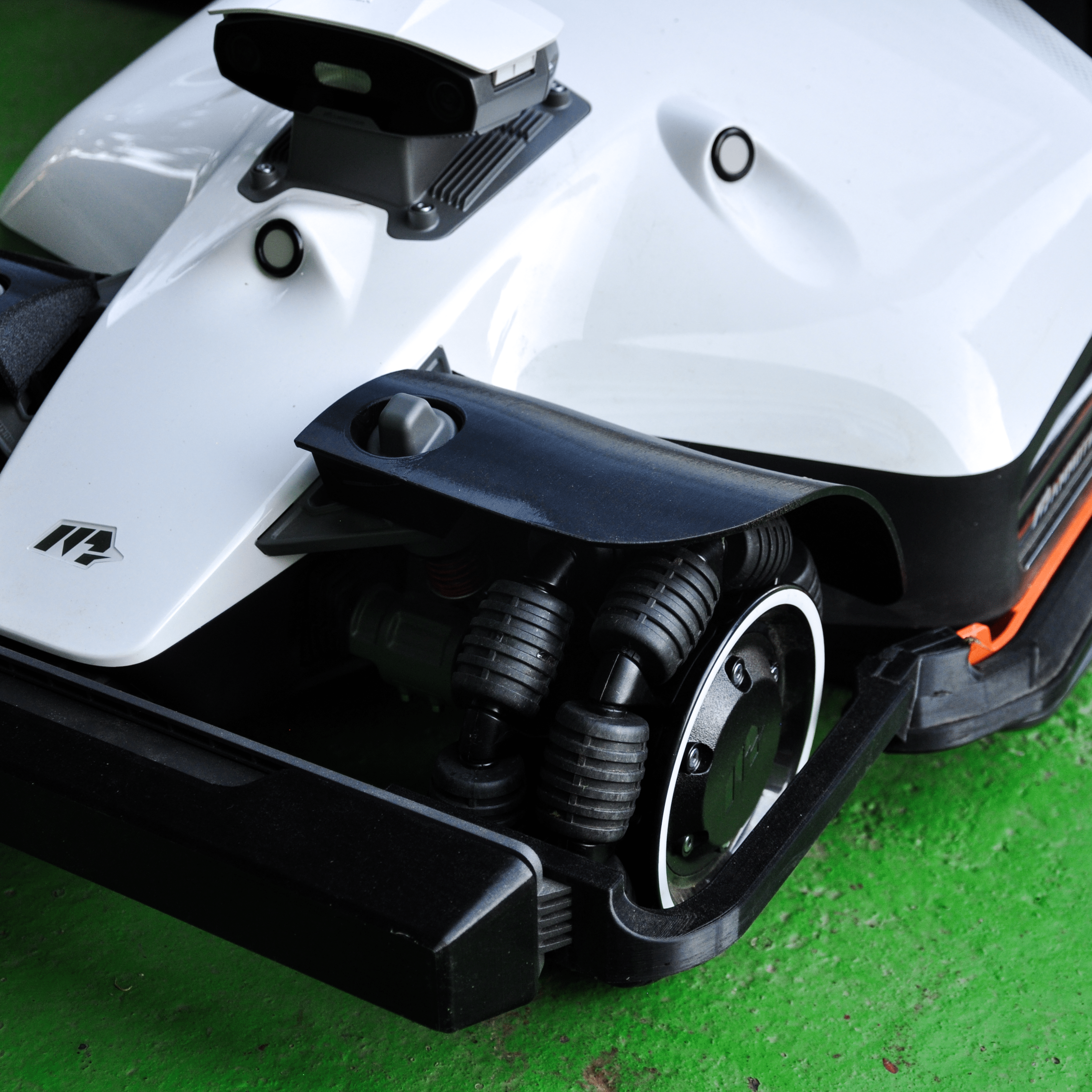 The fenders are made from durable, weather-resistant material. The front fenders mount to the original points, while the rear fenders use a strong double-sided tape and a clip-on system that grabs the mower from the top and bottom like a clamp — no drilling required.